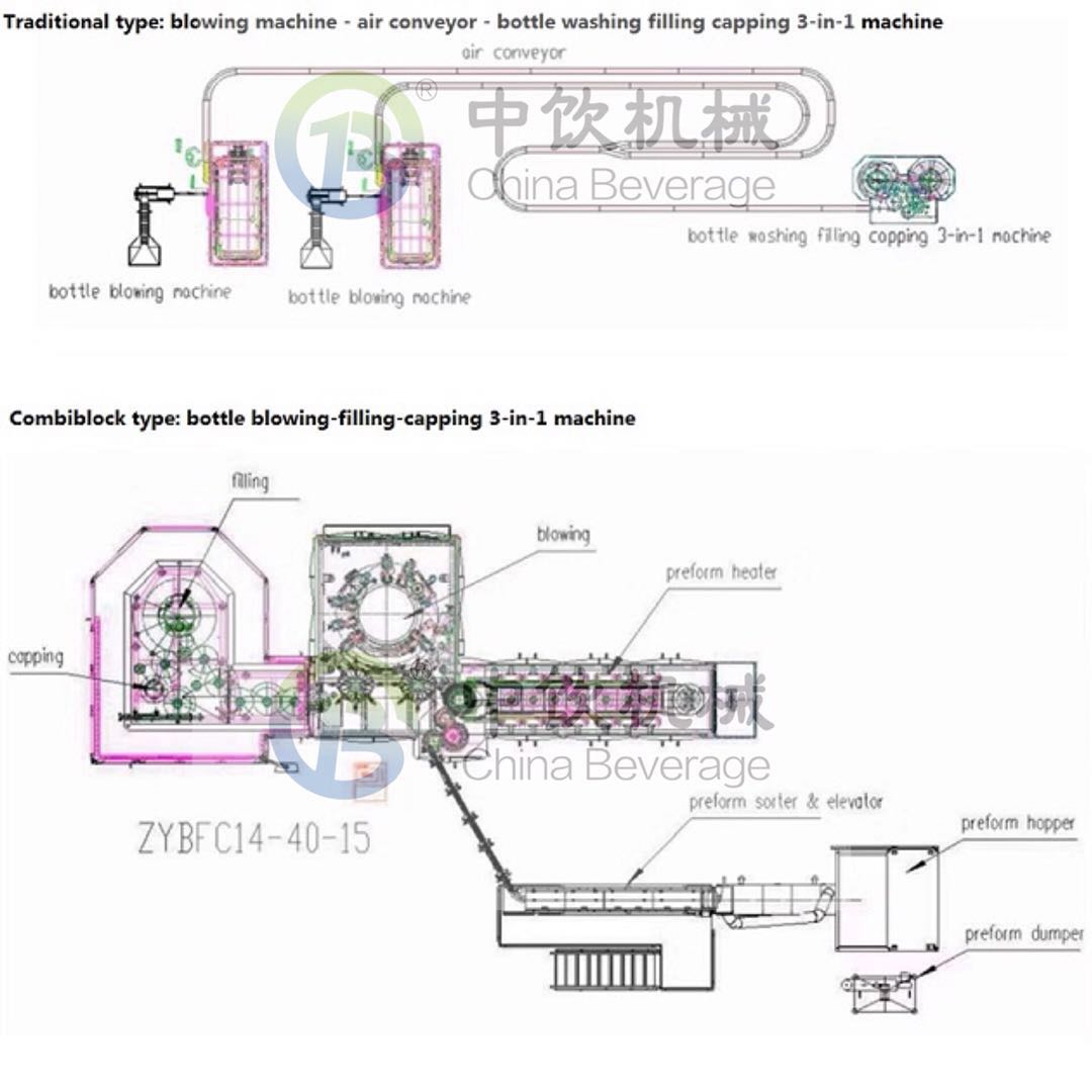 To meet customers' requirement that the blowing machine should be high speed and energy saving, China-Beverage develops fully automatic rotary blowing combiblock system, which combines filling and capping machine together, mainly for the drinking water, CSD and beverage filling line. The advantage of this combiblock system is highly intelligentized, with stable performance, high efficiency and low production cost, and achieves the national food sanitation standards. It is the preferred choice for the middle and large scale beverage factory.